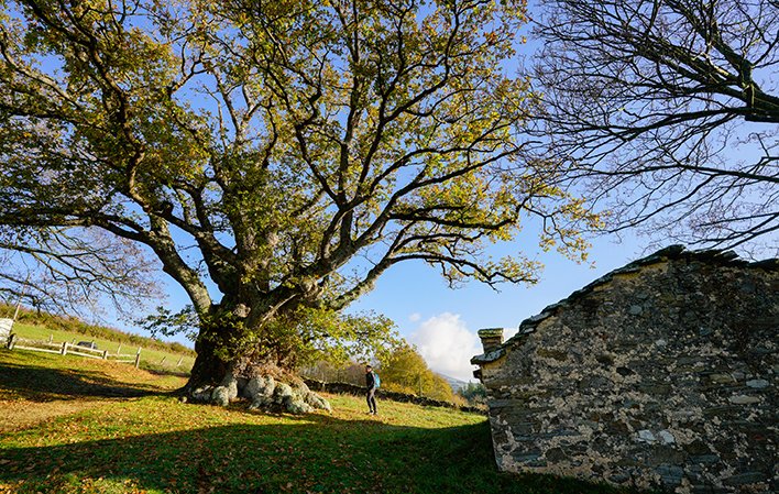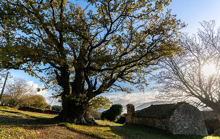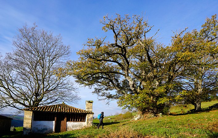 Trata-se de um exemplar de Quercus Robur que não é muito alto, com cerca de 8 m., embora se destaque pelo tamanho do seu tronco, que atinge 10 metros de diâmetro. A antiguidade deste carvalho, bem como o diâmetro do seu tronco, é corroborada por dados históricos citados, segundo a Enciclopédia Asturiana, em documentos anteriores ao descobrimento da América. Eram muito comuns nas Astúrias, mas a grande maioria foi abatida devido à grande qualidade e dureza da sua madeira, muito utilizada para a construção de celeiros e cestos de pão, e também como vigas na construção de igrejas e palácios.