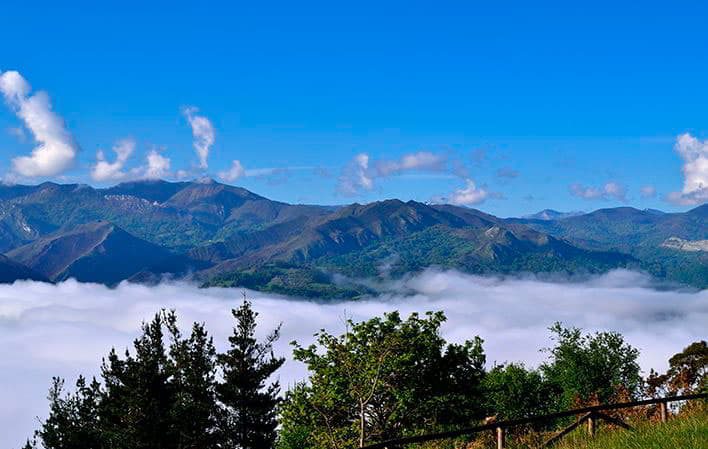 Tomando o caminho da esquerda, logo entramos no meio das árvores e contornamos prados com cercas de madeira até chegarmos a uma pista, que tomamos à esquerda e subimos, ignorando a pista da direita, que desce para a aldeia de El Moru.