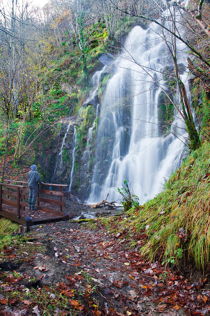 No final, como que enfiada num nicho, surge a cascata, aberta, branca, destacando-se contra a pedra escura, com pequenos saltos laterais que a alargam e embelezam. Outro percurso essencial.