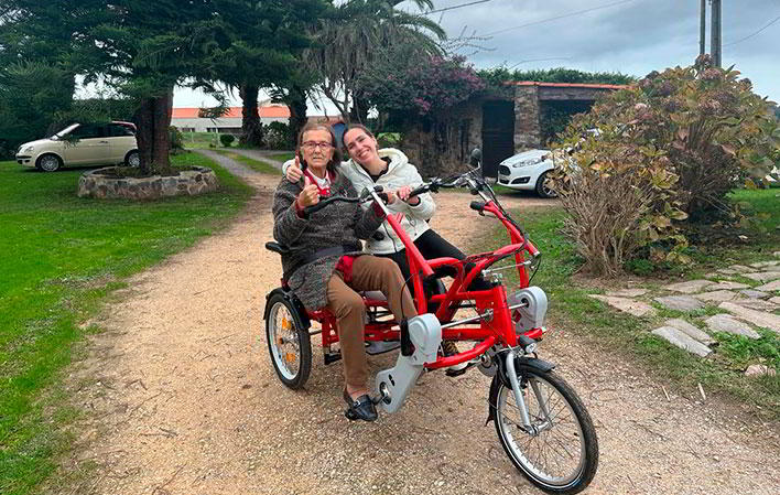 - Bicicletas paralelas de assento duplo, concebidas para pessoas com mobilidade muito reduzida, com arneses, cintos de segurança, pés e três níveis de assistência ao pedal.